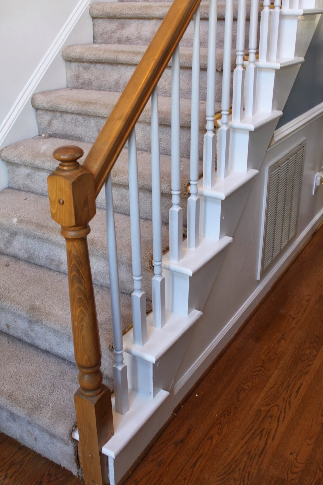 The carpet has been yucky and not bare foot friendly, so we didn't bother being careful as we painted the wall and trim. It looks so crisp and clean with the blue and white. The stairs have bothered me because they were just...off balance. The stair lip matches the banister and ballast posts, but the carpet was uneven on every step. We decided to carpet the stairs because it costs 3X$$$ to place hardwood and difficult to match the floor with stain anyway.So, in preparation for the carpet this week, and with 1 kid home sick 3 1/2 days, another one home sick 1 day (and now I've come down with the head cold) I had the task of painting the step out on the stairs. It wasn't too bad. In retrospect, I should have scrubbed and scraped the step with a trowel before the deglosser. That would have removed a lot of the carpet hair/fuzz that was stuck to it. I cut off about 3 inches of carpet all the way up the stairway along the spindles.